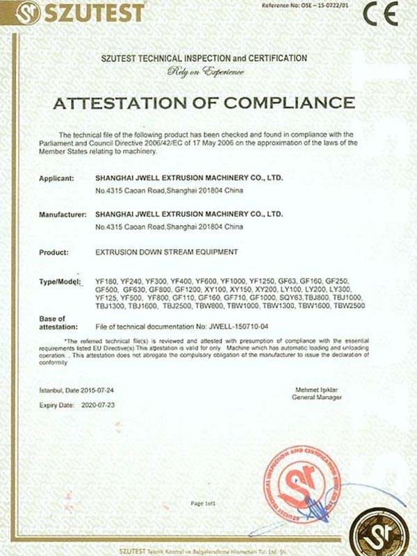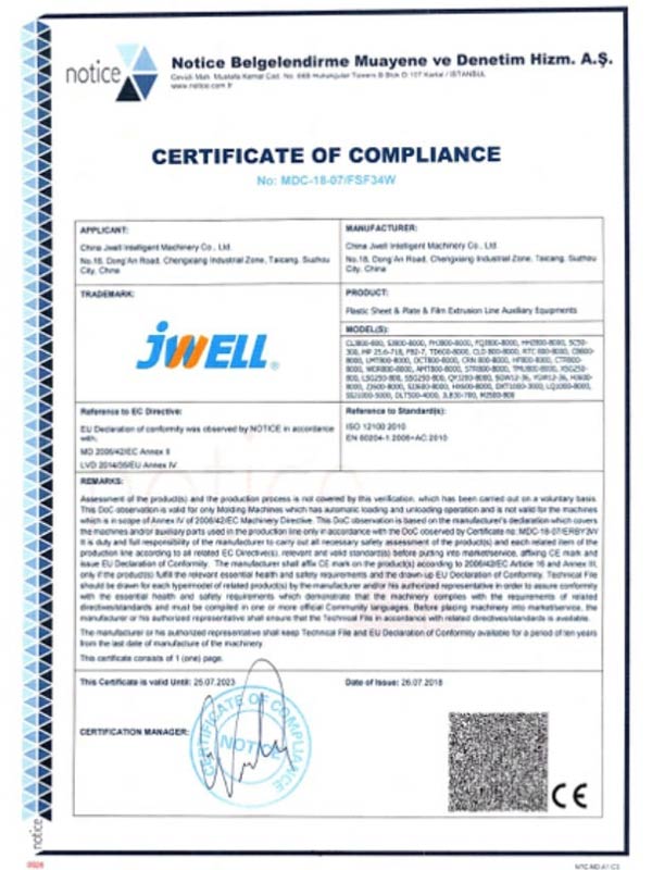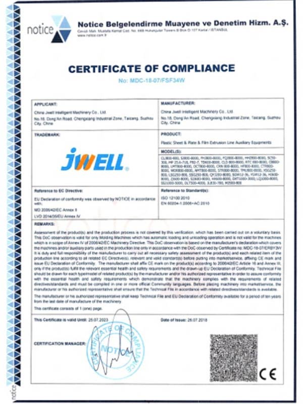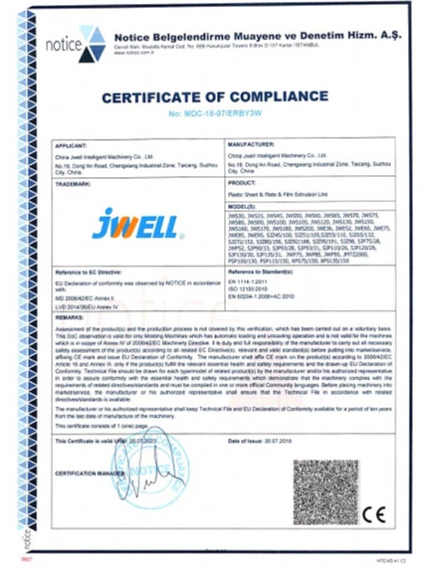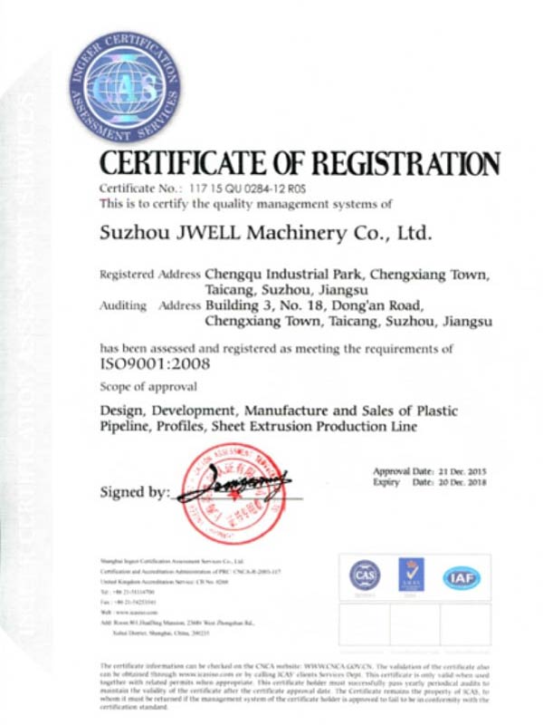 JWELL Machinery China learns the latest technology of plastic extrusion and guarantee high-quality production under the standard of CE certification, IS09001 quality management system certification.